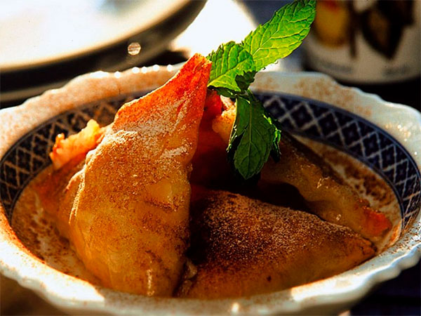 Для начала молоко, крахмал и сахар варят до образования густой кашицы темного цвета. Массу выливают в форму и дают остыть. Затем тесто для пахлавы нарезают на полоски шириной около трех пальцев и длиной 40 см, смазывают маслом. Далее остывшую массу нарезают кубиками и заворачивают в тесто, формируя треугольные мусаки. На противень выкладывают лепешки, смазывают растопленным маслом и запекают в духовке до золотистой корочки. Готовый десерт поливают сиропом, чтобы он не растаял.